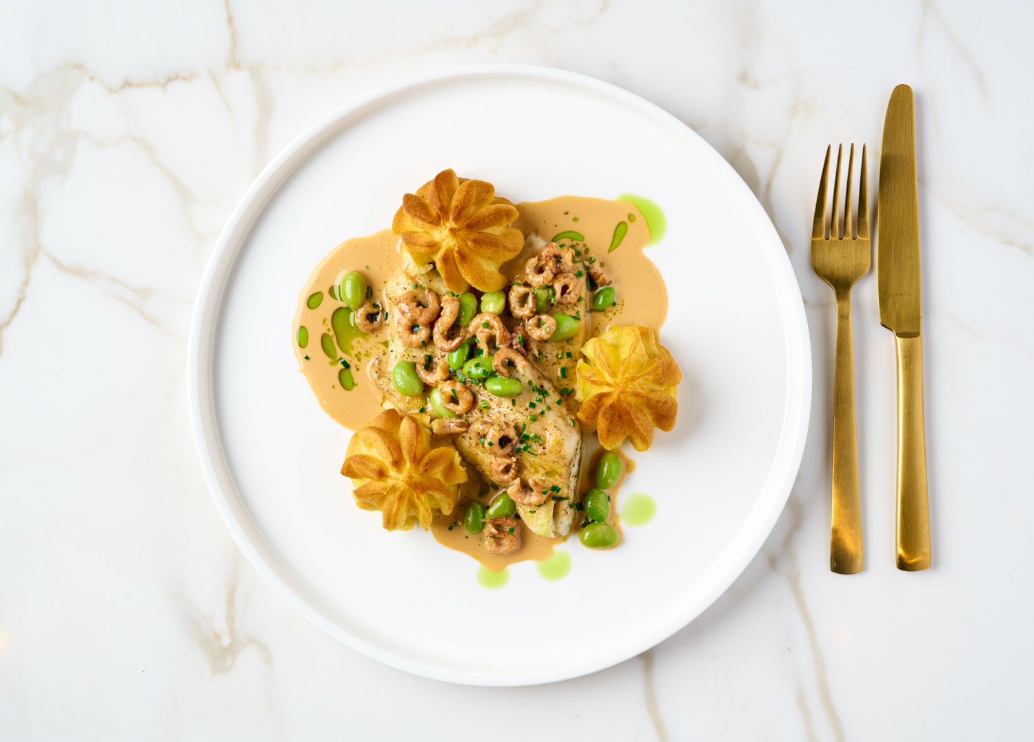 Déposez un peu de sauce au vin blanc dans l’assiette à l’aide d’une cuillère. Disposez le bar par-dessus et nappez d’un peu de sauce supplémentaire. Disposez les edamames tout autour. Terminez avec les pommes duchesse et éventuellement quelques gouttes d’huile de poireau ou d’huile d’olive.
